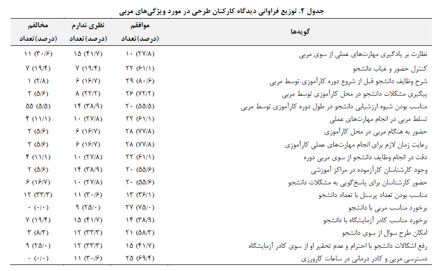 جدول شماره دو توزیع فراوانی دیدگاه کارکنان طرحی در مورد ویژگی­های مربی به تفکیک گویه­ها در هر حیطه در نشان می­دهد. نتایج نشان داد که اکثر پاسخ دهندگان (6/80 درصد) معتقد بودند که قبل از شروع دوره کارآموزی شرح وظایف دانشجو توضیح داده شد. همچنین 8/77 درصد از دیدگاه پاسخ دهندگان موافق بودند که مربی ها حضور به هنگام در کارآموزی ها داشته و زمان کافی برای انجام مهارت‌های عملی در اختیار کارآموزآن قرار دادند. این در حالی است که تنها 8/27 درصد شرکت کنندگان با وجود نظارت بر یادگیری مهارت­های عملی در طی کارآموزی آنان موافق بودند.
