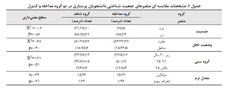 نتایج نشان داد که بیشترین فراوانی دانشجویان پرستاری شرکت کننده در مطالعه 24 نفر (75 درصد) را زنان، 27 نفر (37/84 درصد) مجرد و 16 نفر(50 درصد) مربوط به گروه سنی 21 تا 25 سال بود. مشخصات مقایسه ای متغیرهای جمعیت شناسی دانشجویان پرستاری در دو گروه مداخله و کنترل در جدول شماره یک آورده شده است.