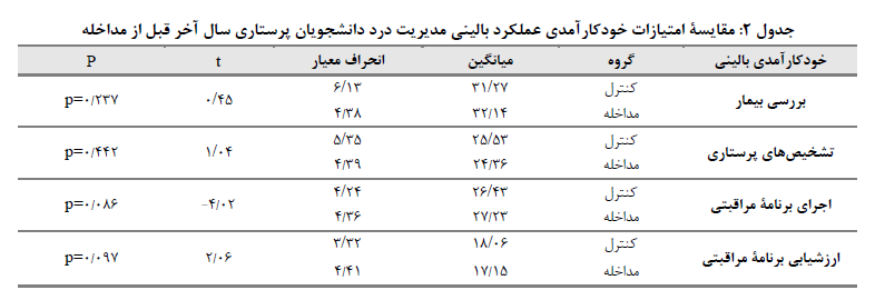 نتایج آزمون t گروه های مستقل نشان داد که بین میانگین امتیازات خودکارآمدی بالینی دانشجویان پرستاری در حیطه بررسی، تشخیص پرستاری، اجرای برنامه مراقبتی و ارزشیابی برنامه مراقبتی با قبل از اجرای آموزش مدیریت درد اختلاف معنی داری وجود ندارد (جدول 2).