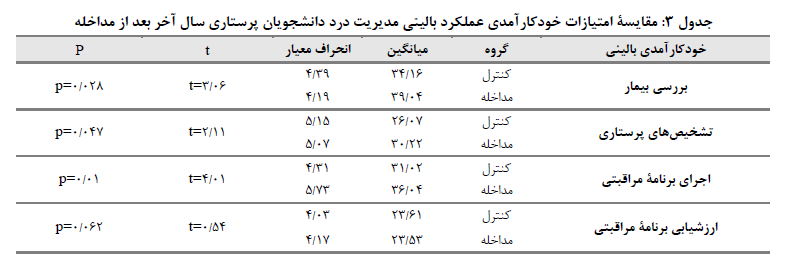 نتایج جدول شماره سه نشان داد که بین میانگین امتیازات خودکارآمدی عملکرد بالینی در حیطه بررسی، تشخیص پرستاری، اجرای برنامه مراقبتی بین گروه مداخله و کنترل بعد از اجرای آموزش مدیریت درد اختلاف معنی داری وجود دارد و فقط امتیازات خودکارآمدی عملکردی در حیطه ارزشیابی برنامه مراقبتی از اختلاف معنی داری برخوردار نبود.