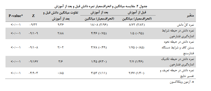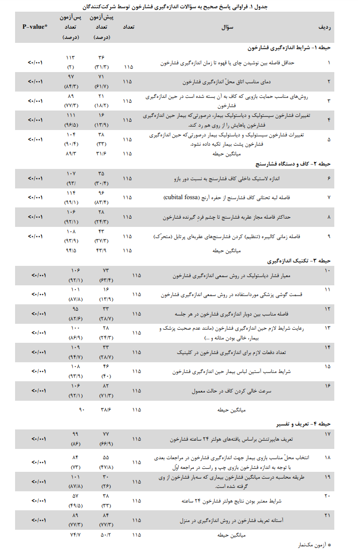 در جدول 1 فراوانی پاسخ صحیح به سؤالات اندازهگیری فشارخون توسط شرکتکنندگان ارائه شده است. میزان درصد دانش قبل از تماشای فیلم (1/41) و پس از تماشای فیلم (1/87) بود. طبق نتیجه آزمون کولموگروف اسمیرنوف، نمرههای سطح دانش قبل و بعد از آموزش دارای توزیع نرمال نبودند و از آزمونهای ناپارامتریک برای تحلیل آنها استفاده شد که تفاوت نمره دانش قبل و بعد از آموزش برای 21 سؤال همچنین برای 4 حیطه پرسشنامه معنادار است (001/0>P).