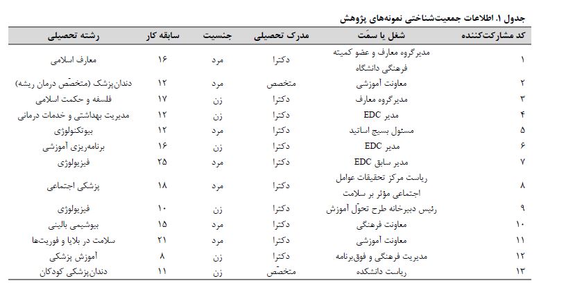 در این پژوهش 13 مصاحبه انجام و کدگذاری باز انجام شد ویژگیهای جمعیتشناختی افراد مشارکتکننده در مصاحبه در جدول 1 ذکر شده است.