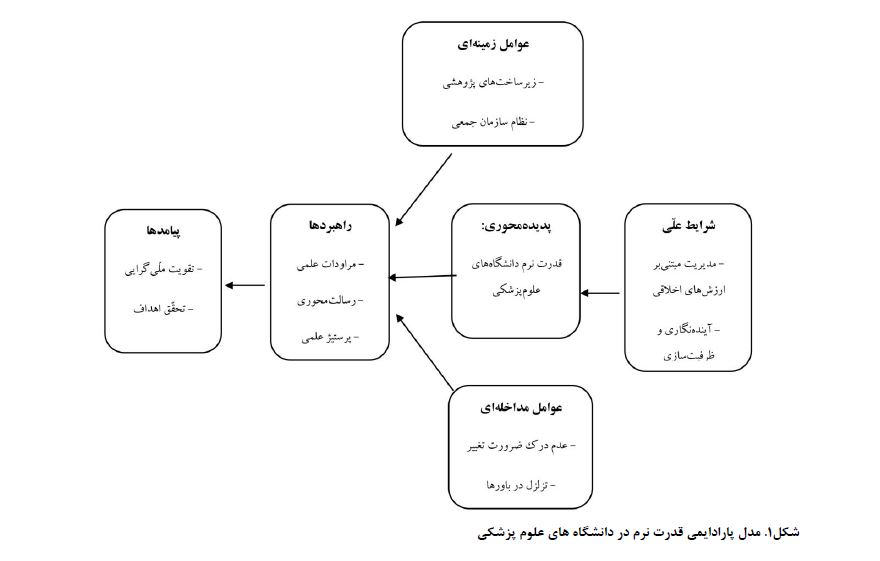 مدیریت مبتنی بر ارزشهای اخلاقی، آیندهنگاری و ظرفیتسازی و تقویت روابط بینالملل با همدیگر آموزش جامعهبنیان را تشکیل میدهند که بر پدیده قدرت نرم تأثیر میگذارند. اقداماتی که باید برای قدرت نرم در دانشگاههای علومپزشکی انجام شوند، تحتعنوان راهبردها شامل راهبرد متعهّدانه که با رشد اخلاق حرفهای و تعهّد به جامعه صورت میپذیرد و دانشافزایی که با رسالتمحوری و اعتبار علمی نقش خود را ایفا میکند، هستند. ازطرفی، مهندسی فرهنگ شامل بالندگی و بهسازی، نظام سازمان جمعی و ارتقای زیرساختهای پژوهش با ایجاد شرایط ویژه بر راهبردها مؤثر است. تخریب موفقیت شامل عواملی نظیر تزلزل در باورها و عدم درک ضرورت تغییر در راهبردهاست. اگر شرایط ویژه برای عملیاتی شدن راهبردها مهیّا و عوامل مداخلهای کنترل شود، اهداف محقّقشده و ملّیگرایی تقویت و بهطورکلی، نهادینهسازی فرهنگی انجام میشود.