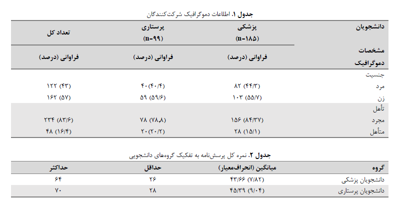 میزان پاسخدهی در این مطالعه 7/94 درصد بود. از کل شرکتکنندگان که براساس تعیین حجم نمونه 300 نفر تعیین شده بودند، 284 نفر به پرسشنامهها پاسخ دادند که از این تعداد 122 نفر مرد (43 درصد) و 162 نفر زن (57 درصد) بودند. میانگین سنی شرکتکنندگان در گروه دانشجویان پرستاری 88/1±84/24 و در گروه دانشجویان پزشکی 72/1±39/25 بود. سایر دادههای دموگرافیک در دو گروه دانشجویی در جدول 1 آورده شده است.