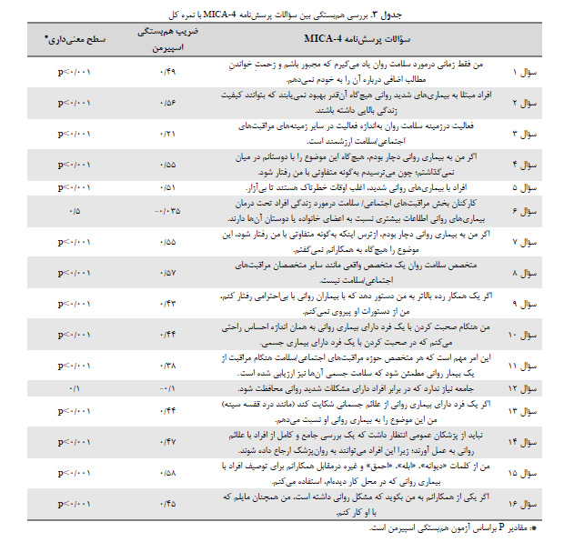 بررسی روایی ساختاری بهوسیله بررسی همبستگی بین سؤالات پرسشنامه MICA-4 با نمره کل آن با استفاده از آزمون همبستگی پیرسون انجام شد. همانطور که در جدول 3 مشاهده میشود، همبستگی بین سؤال مربوط و نمره کل در تمامی سؤالات؛ بهجز سؤال 3، 6 و 12 بیشتر از 4/0 بوده است (001/0>p). بنابراین موفقیت مقیاس (scaling success) 16/13 (25/81 درصد) بوده است.