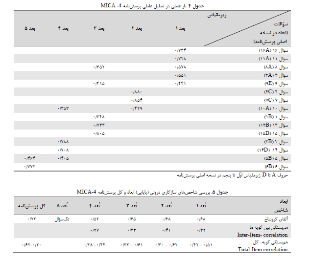 پرسشنامه MICA-4 از این جنبه که میتواند طیفهای مختلف عاملان سلامت را ارزیابی و زمینه مقایسه گروههای متفاوت را فراهم کند، از اهمیت ویژهای برخورد است. مطالعه حاضر بهعلت استفاده از تحلیل عامل اکتشافی میتواند دیدگاهی متفاوت از ساختار توصیهشده نسخه اصلی ارائه دهد و همانطور که در مطالعه فرناندس (Fernandes) ذکر شده است، آغازی برای بررسی بیشتر و تحلیل این پرسشنامه باشد (29). گروهبندی سؤالات این پرسشنامه در زیرمقیاسهای متفاوت در مطالعات و جمعیتهای مختلف میتواند نشاندهندۀ جنبههای متفاوتی از درک سؤالات توسط جمعیتها باشد.