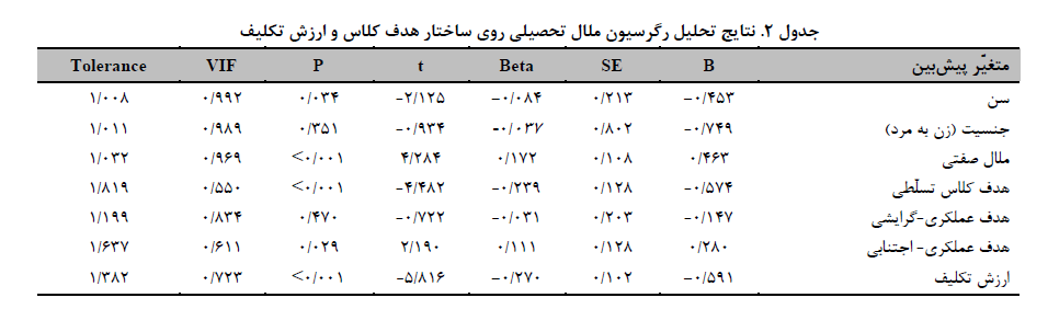 (37). مقدار این آماره برابر با 959/1 و نشاندهنده استقلال خطاهاست. بنابراین، همگی شاخصها حاکیاز برقراری پیشفرضهای لازم برای انجام تحلیل رگرسیون است. نتایج تحلیل رگرسیون همزمان در جدول 2 ارائه شده است.همانطور که در جدول 2 مشاهده میشود، مؤلّفههای ارزش تکلیف (001/0p≤، 270/0- = ß) و ساختار هدف کلاس تسلّطی (001/0p≤، 239/0- = ß) بهصورت معکوس و به ترتیب بیشترین قدرت پیشبینیکنندگی ملال تحصیلی را داشتند. همچنین، ساختار هدف عملکردی- اجتنابی (029/0=p، 111/0 = ß) بهصورت مستقیم ملال تحصیلی دانشجویان علومپزشکی را پیشبینی میکند، اما ساختار هدف عملکردی -گرایشی نتوانست ملال تحصیلی دانشجویان را پیشبینی کند. مقدار ضریب تعیین (R2) برابر با 323/0 بود که بیانگر این است 3/32 درصد تغییرات در نمره ملال تحصیلی دانشجویان توسط متغیّرهای موجود در مدل تبیین شده است.