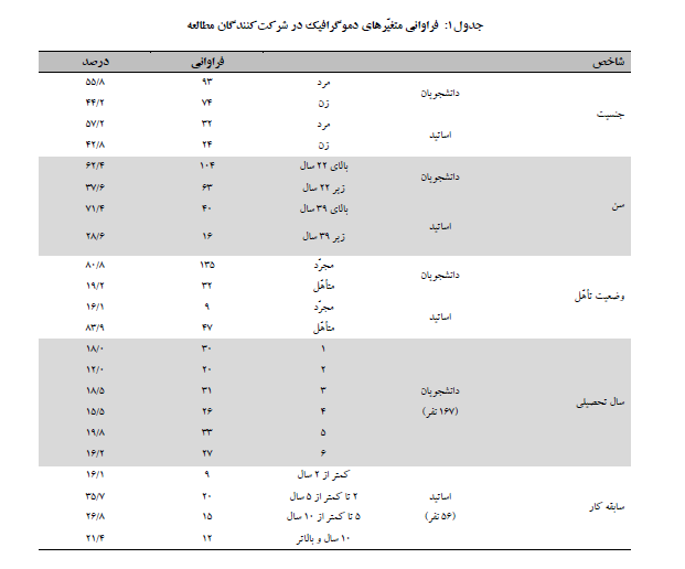 ۲۴۰ نفر در این مطالعه شرکت کردند که بعد از بررسی نهایی پرسشنامهها و حذف پرسشنامههای ناقص، ۲۲۳ پرسشنامه وارد مطالعه شدند (میزان پاسخگویی: 9/92 درصد). ۱۶۷ نفر از شرکتکنندگان دانشجو و ۵۶ نفر از اعضای هیئت علمی دانشکده دندانپزشکی بودند. از دانشجویان شرکتکننده، ۵۰ نفر (30 درصد) در مقطع علوم پایه و ۱۱۷ نفر (70 درصد) در مقطع بعد از علوم پایه در حال تحصیل بودند. میانگین سنّی دانشجویان ۲۲/۵ ± ۶۷/۲۲ سال و میانگین سنّی اساتید ۰۱/۸ ± ۲۲/۳۹ سال بود. توزیع متغیّرهای دموگرافیک شرکتکنندگان در جدول ۱ آمده است.