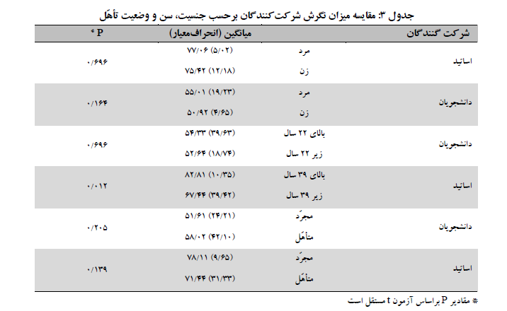 جدول ۳ مقایسه میزان نگرش شرکتکنندگان برحسب جنسیت، سن و وضعیت تأهّل را نشان میدهد. نتایجْ تفاوت معنیداری را برحسب جنسیت در دو گروه نشان نداد (05/0P >) اما در گروه سنی بالای ۳۹ سال اساتید، نگرش درمورد مباحث قانونی و اخلاقی آموزش مجازی بهطور معنیداری مثبتتر بود (012/0 P =). همچنین پس از مقایسه سنّی دانشجویان بالای ۲۲ سال با دانشجویان زیر ۲۲ سال، تفاوت معنیداری بین این دو گروه در این زمینه وجود نداشت. علاوه بر این تفاوت معنیداری نیز بین نگرش اساتید و دانشجویان مجرّد با متأهّل وجود نداشت (05/0 P >).